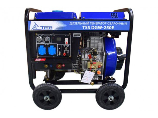 Сварочный дизельный генератор ТСС DGW-250E — предназначен для проведения Ручной Дуговой Сварки в условиях отсутствия сети электроснабжения. Широко используется на строительных, монтажных и ремонтных площадках. Для проведения сварочных работ рекоммендуется использовать именно Сварочный Генератор, т.к. это намного практичнее, надежнее и экономичнее чем использовать пару устройств: генератор электроэнергии и сварочный аппарат. Кроме основной Сварочной Функции данный сварочный генератор может использоваться и как Автономный Источник Электроснабжения для подключения потребителей энергии.